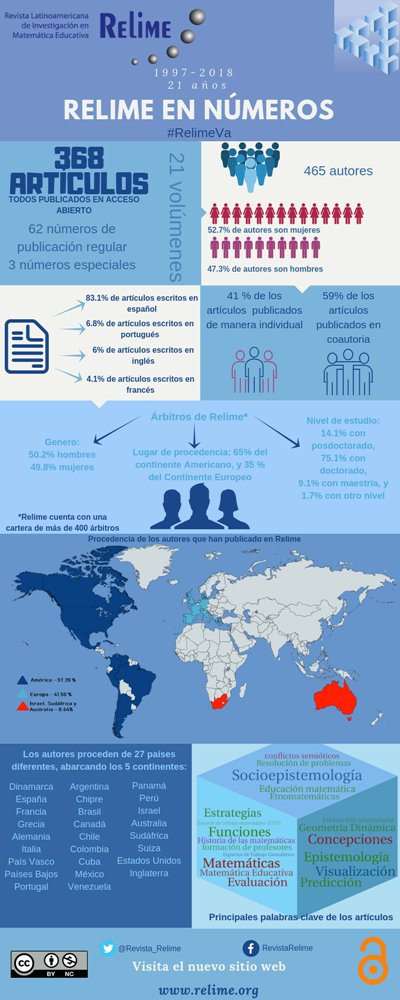 Compartimos con la comunidad la serie "Relime en Números", en la cual damos a conocer algunos datos de la revista que abarcan el periodo de 1997 a 2018.
